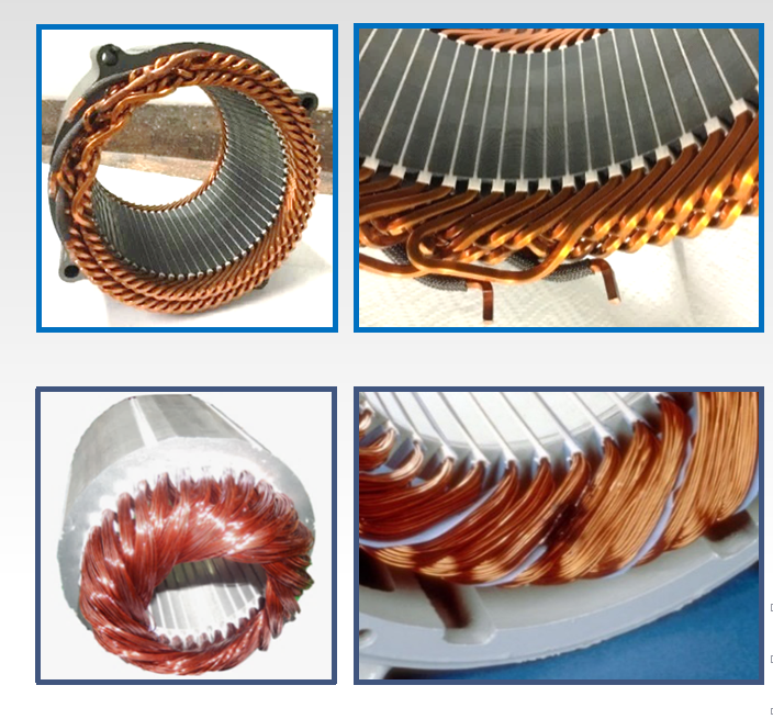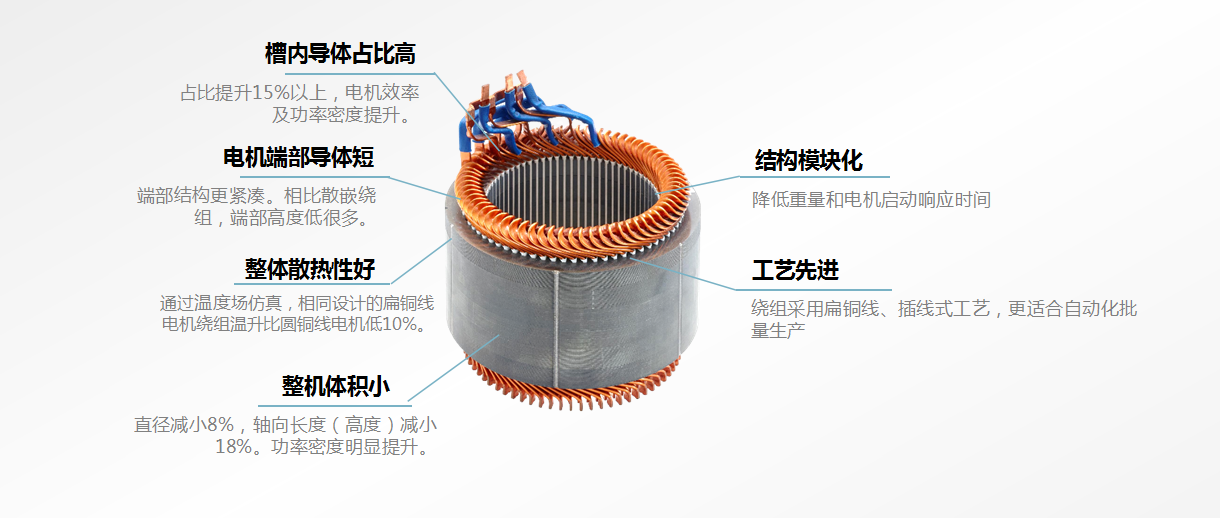 发卡电机端部扁铜线排布紧凑,使端部高度降低,减少了无效铜的使用,使铜损降低。